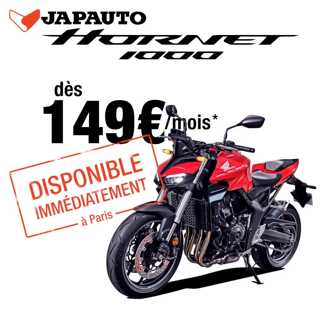 *Location avec option d'achat avec premier loyer majoré de 1500€ TTC suivi de 48 mensualités de 148,09€ TTC garantie perte financière incluse. Montant dû avec l’option d’achat finale 13 738,24€ TTC. Offre accessible aux particuliers et aux professionnels pour l'achat d'une CB1000 Hornet MY25 au tarif de 10 599€ TTC. Un crédit vous engage et doit être remboursé. Vérifiez vos capacités avant de vous engager.