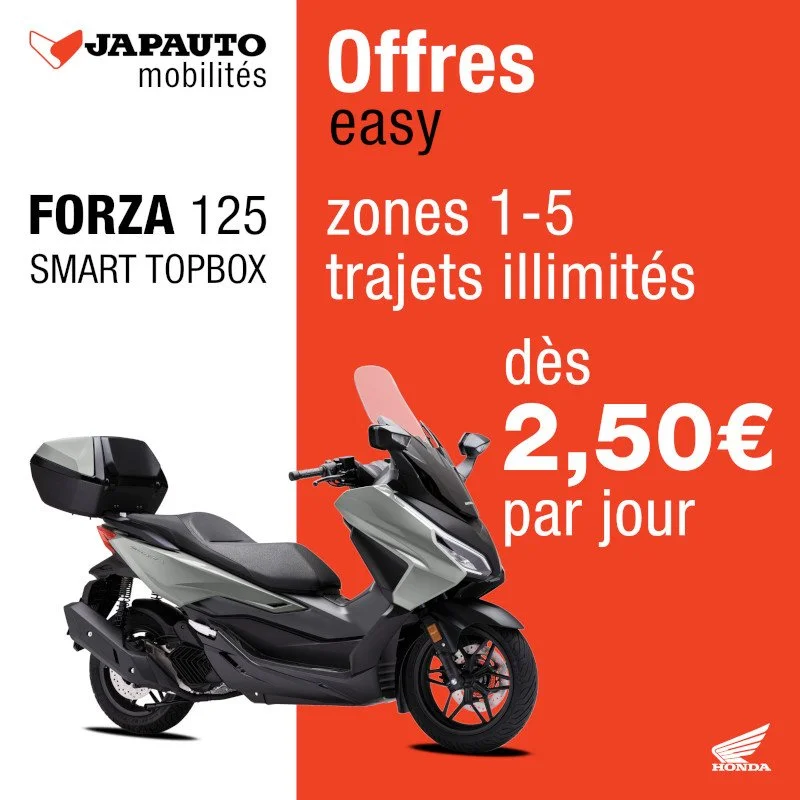 * Location avec Option d'Achat 36 mois avec premier loyer de 1 950€ TTC suivi de 35 loyers de 68,03€ TTC assurance Perte Financière incluse. Option d’Achat Finale 3 057,08€ TTC. Offre réservée aux particuliers et aux professionnels pour l'achat d'un scooter Honda Forza 125 Smart TopBox 2025 au tarif catalogue de 5 999€ TTC sous réserve d'acceptation par Honda Financial Service. Détails et souscription en concession. Un crédit vous engage et doit être remboursé. Vérifiez vos capacités avant de vous engager.